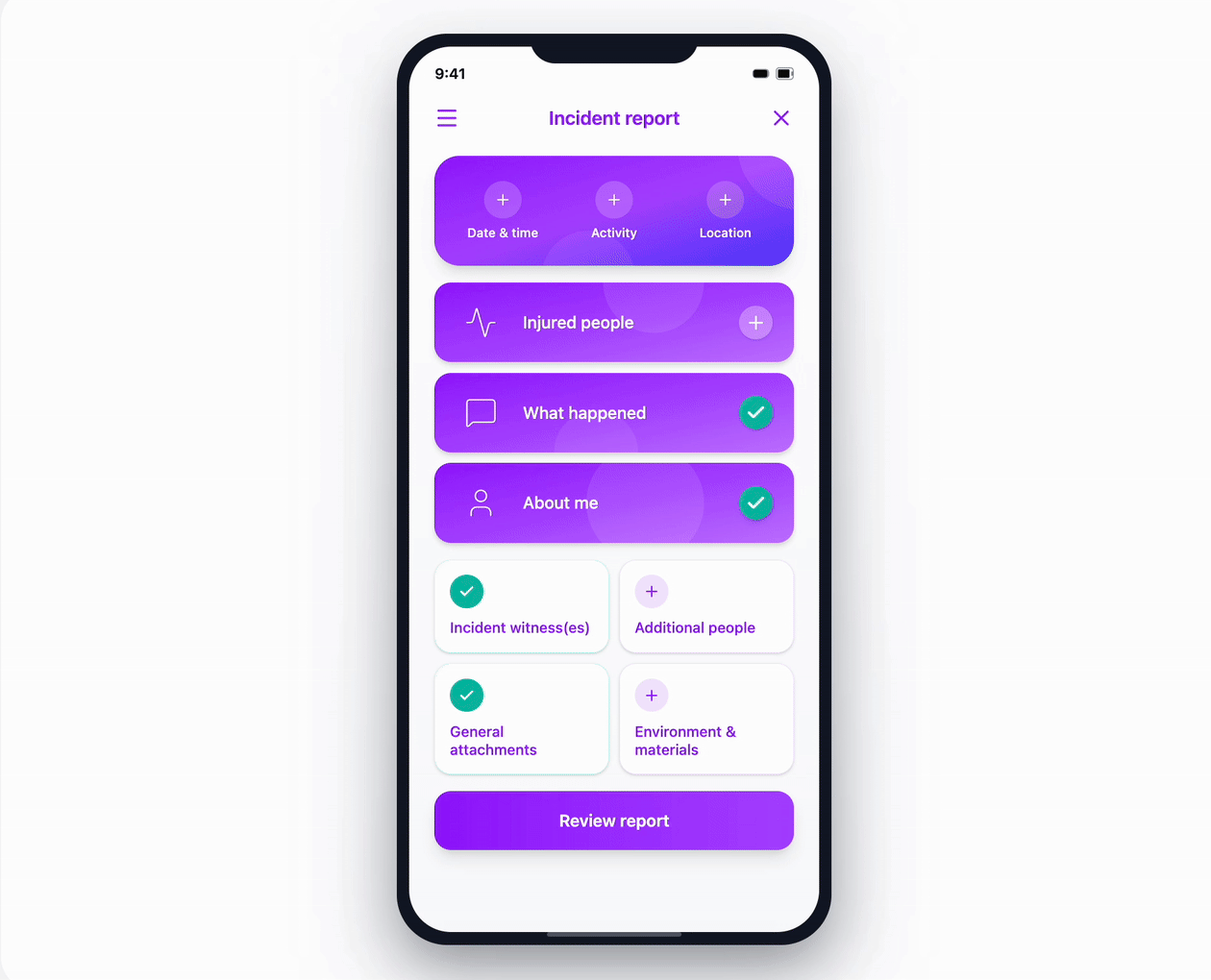 Injury, accident, and near-miss reports share the same underlying structure, reducing relearning and supporting repeat use.