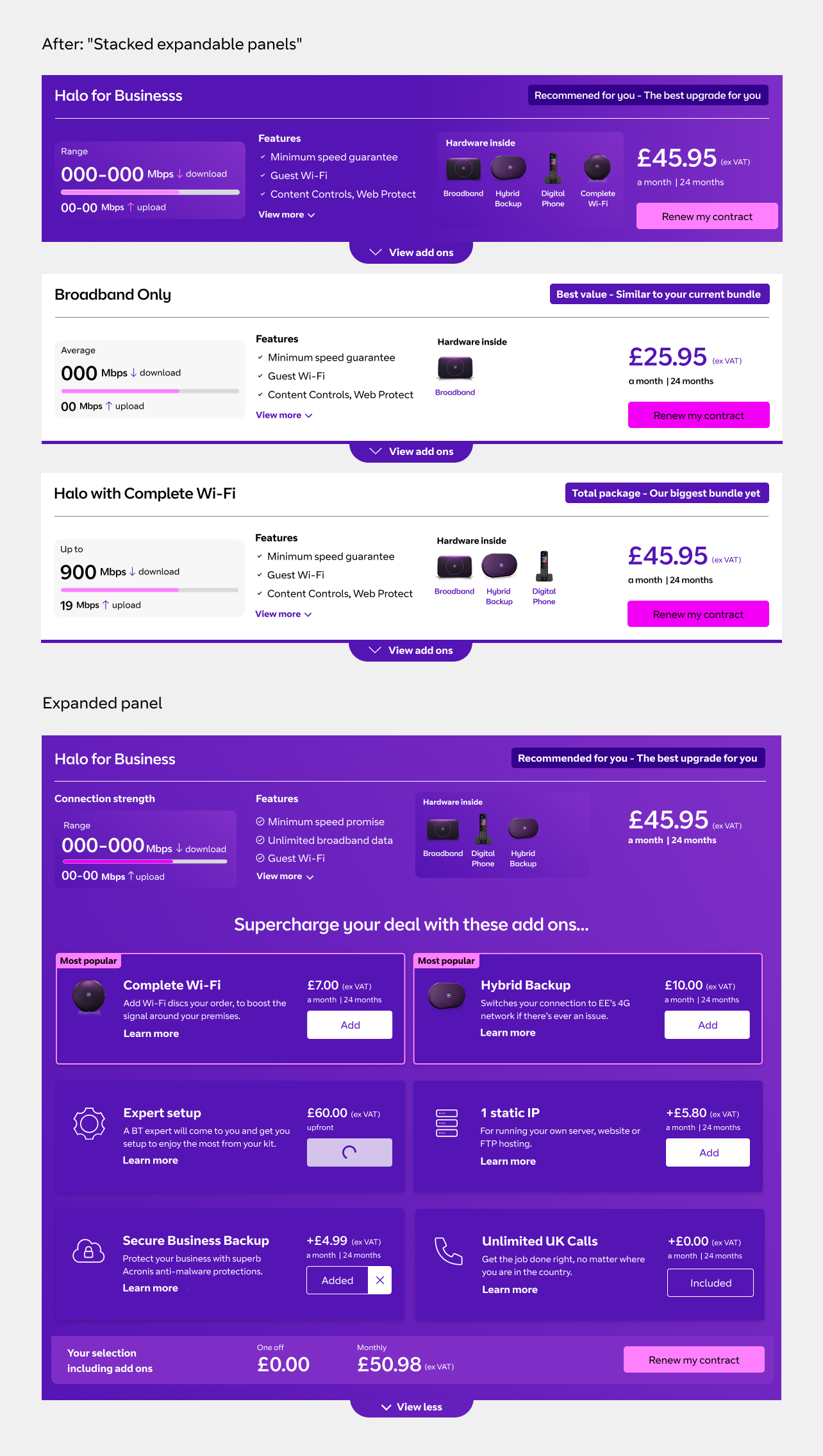The Trade-off: By consolidating information into expandable inline modules, we had to be selective about what appeared by default versus what lived behind "View more" or "Learn more" links. We couldn't show every single feature or add-on option at once - we prioritized what research told us users needed to make a decision (speed, price, core features, popular add-ons).