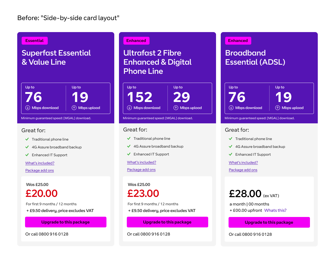 Side-by-side comparison: Users couldn't view all three packages simultaneously anymore, which some stakeholders worried would reduce package consideration